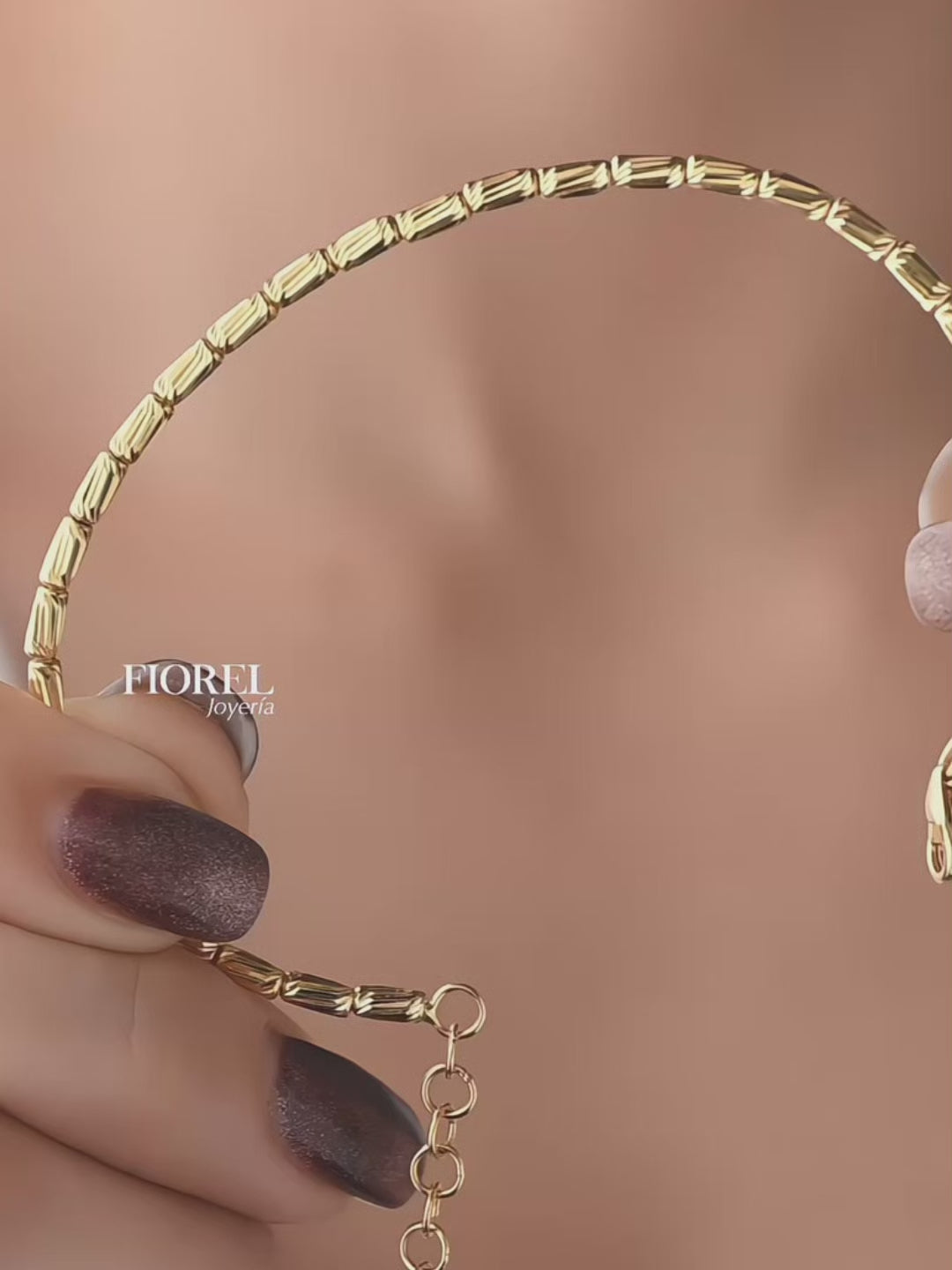 Elegante y versátil, pulso italiano en oro 18 kilates, destaca por su diseño de cilindros con acabado diamantado que capturan la luz con sutileza. Ligera, cómoda y con cierre ajustable, es el complemento perfecto para cualquier ocasión.